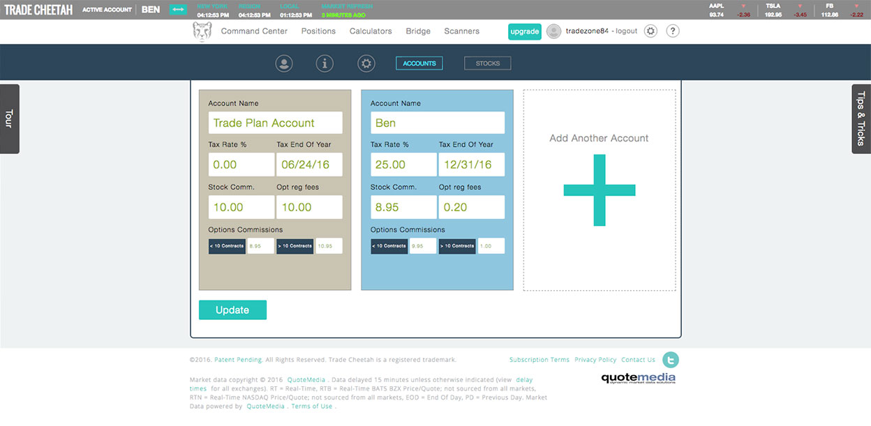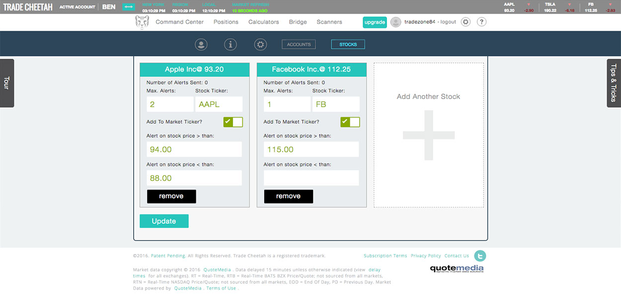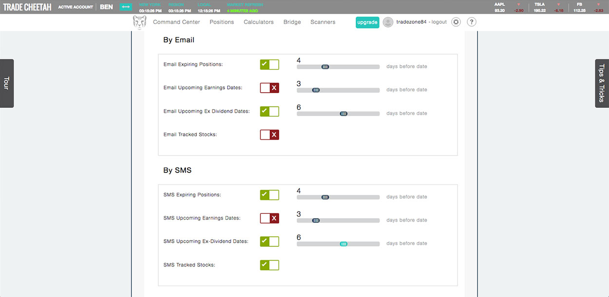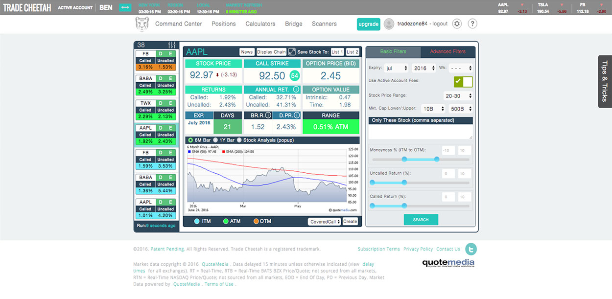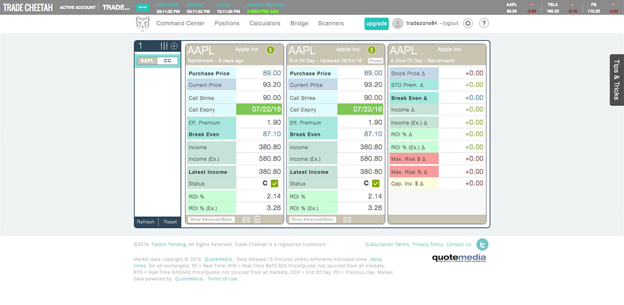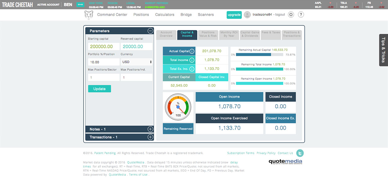 See all your positions in one place—clear, concise, and actionableInstantly view returns, status, portfolio allocation, and key dates like earnings, ex-div, expirations and much moreMonitor performance with intuitive, interactive charts that make analysis effortless.Positions OverviewScan the entire market in seconds—filtered by your goalsSee returns on calls and puts based on your parameters, plus technicals, fundamentals, charts, news, and full option chainsFound a trade? Create your position instantly with one clickMarket ScannersMonitor every key metric—updated in real timeTrack income, dividends, ROI, taxes, allocation, risk, commissions, and more with precisionSet your strategy, and let Trade Cheetah keep your portfolio within targetPortfolio TrackingAccess everything you need—InstantlyToggle between basic and advanced views for quick checks or deep divesTrack each position and strategy with an interactive matrix, and keep searchable records of closed trades to measure progress over timeTrack & EvolveCreate your positions automatically according to your strategy from scratch or from the best positions returned by the scannerTry endless scenarios; change strike, premium, number of shares and more to find the best possible combination to meet your desired outcomeAccess relevant information and numbers for any stock (values, news, quotes, chains, charts) to maximize your knowledge and improve your chances for profit with every positionCreate Your PositionFind the relevant information for your positions in one place. Select between basic and advanced view modes for a quick or detailed reviewKeep precise records of all the relevant numbers related to your positions in an interactive matrix, displaying positions individually and by strategyStore searchable historical records of your closed positions in chronological order for easy reference, to follow your progress through timeSave Your PositionsTrack multiple accounts simultaneously, completely independently of each other, under one single user accountSet individual parameters for each account (tax rate, commissions, fees, etc)Easily compartmentalize your positions by strategy or trade plan, and revisit them when you are readyMultiple AccountsExperiment with as many different strategies and positions as you desire. Leave your calculators and spreadsheets behind foreverTrade Cheetah keeps an eye on the relevant dates and numbers (earnings dates, dividend dates, expiry, prices and time values) so you can relaxSet your date threshold numbers and receive alerts via email or SMS, within your desired time frame. Trade Cheetah allows you to customize all alerts individuallyAuto NotificationsTrack stocks you are interested in followingSet upper and lower price barriers for each stock, and be notified via email or SMS when the stock breaks the barriersTrack Your StocksChoose the number of times to be notifiedAllows up to three stocks to be added to your quick view listUse your Trade Plan account to enter and follow any virtual trades of interest to youGet daily comparisons of your benchmark trades against live tradesPlan Your TradesChoose when to enter the position with one clickPlan your positions in advance and let us tell you when is time to executepreviousnext/0{{total_slide_count}}0{{current_slide_index}}